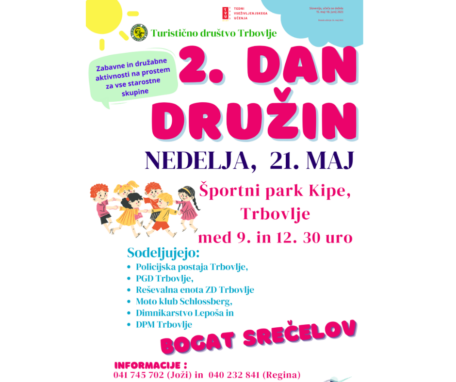 Vabljeni na 2. DAN DRUŽIN, ki ga prireja Turistično društvo Trbovlje v Športnem parku Kipe Trbovlje, ki bo potekalo med 9. in 12.30 uro. Sodelujejo PP Trbovlje, PGD Trbovlje, Reševalna enota ZD Trbovlje, Moto klub Schlossberg, Dimnikarstvo Lepoša in DPM Trbovlje... Prirejene bodo zabavne in družabne aktivnosti na prostem, za vse starostne skupine, med drugim tudi BOGAT SREČELOV. Tudi Zavod za mladino in šport Trbovlje pride na lokacijo za promocijo mladinskega programa - za vsakega se bo torej kaj našlo! Se vidimo na Kipah!