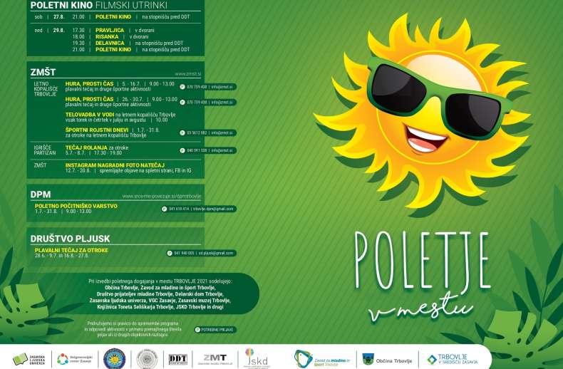 Spodaj si lahko ogledate program poletnega dogajanja v našem mestu. Vabljeni, da izberete zase tiste najbolj vabljive in se jih udeležite. [embeddoc url=”https://zmst.si/wp-content/uploads/2021/06/zgibanka_POLETJE-TRBOVLJE-2021.pdf” download=”all” viewer=”google”]