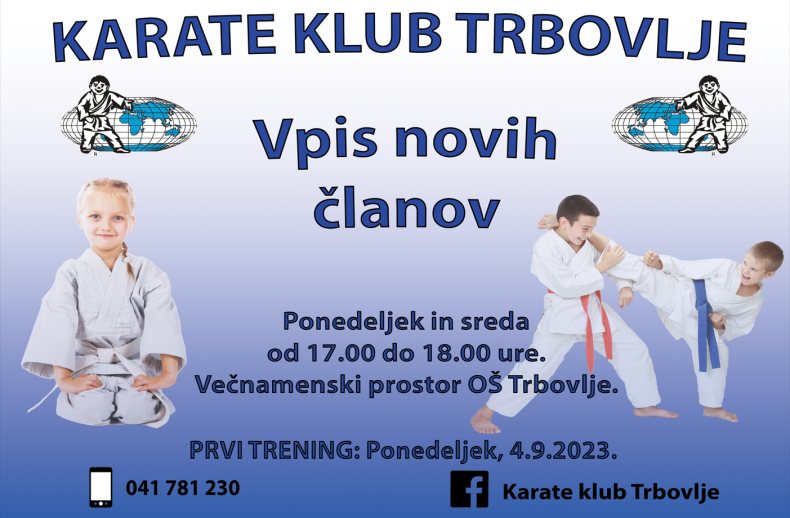 Karate klub Trbovlje vas vabi k vpisu na Začetni tečaj karateja. Vpis in prvi trening bo v ponedeljek, 4. septembra, ob 17.00 uri v Večnamenskem prostoru OŠ Trbovlje. Za več informaciji so vam na voljo na tel: 041 781 230 Vabljeni.